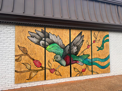 Nathan also brought his vision to Santos Coffee with a custom-designed mural of the quetzal, the national bird of Guatemala and a symbol represented in the Santos Coffee logo. Customers can find this piece at Santos Coffee Gardendale.